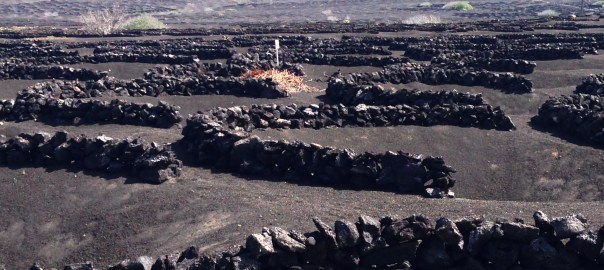 Lanzarote, a UNESCO designated biosphere reserve and one of the seven paradisiac Canary Islands off the coast of Spain, is ever spring-like. One might describe it as the Hawaii of Europe. But, does this weather create an interesting wine? A grapevine needs stress, and this is usually accommodated with cool nights and warm days. In Lanzarote, trade winds cause stress, and in an effort to protect the grapevines, the use of volcanic stones are arranged in a scallop shape as a barrier to the direction of the wind, as pictured above.